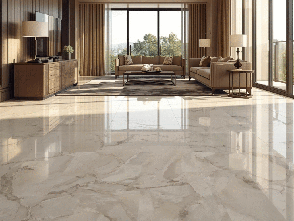 Premium porcelain tiles reflect light and appear to change color because of how their surface finish and material structure interact with light. Here’s a breakdown of why that happens: